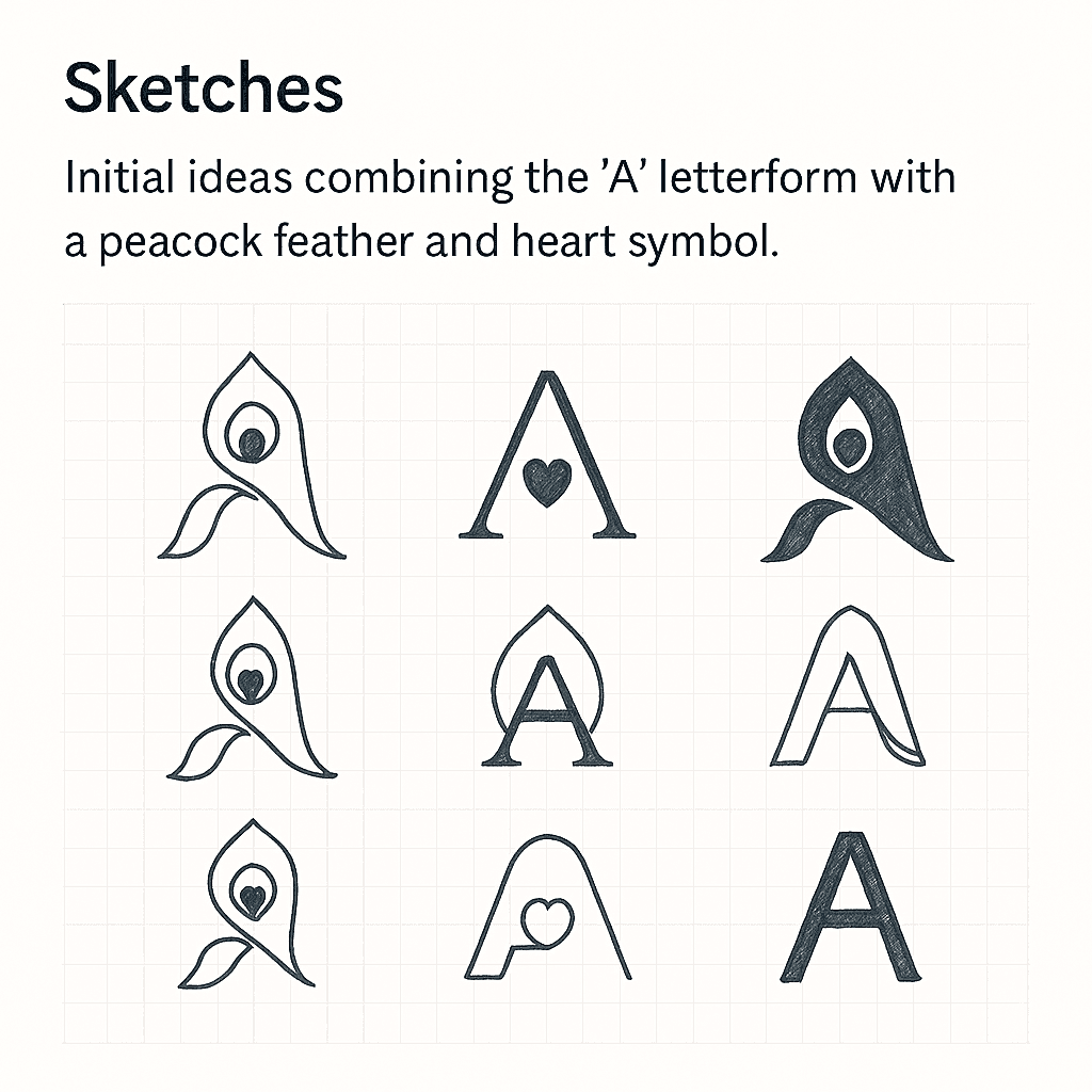 With the foundation in place, the next phase involves exploring as many visual possibilities as possible through sketches. The focus is on how the A can be stylised to echo the graceful curve of a feather without losing its basic letterform. Variations play with the angle of the A, the thickness of the stems, and the way negative space can suggest the inner “eye” of the peacock feather. Heart-like curves appear in some versions to evoke compassion, softness, and emotional warmth.