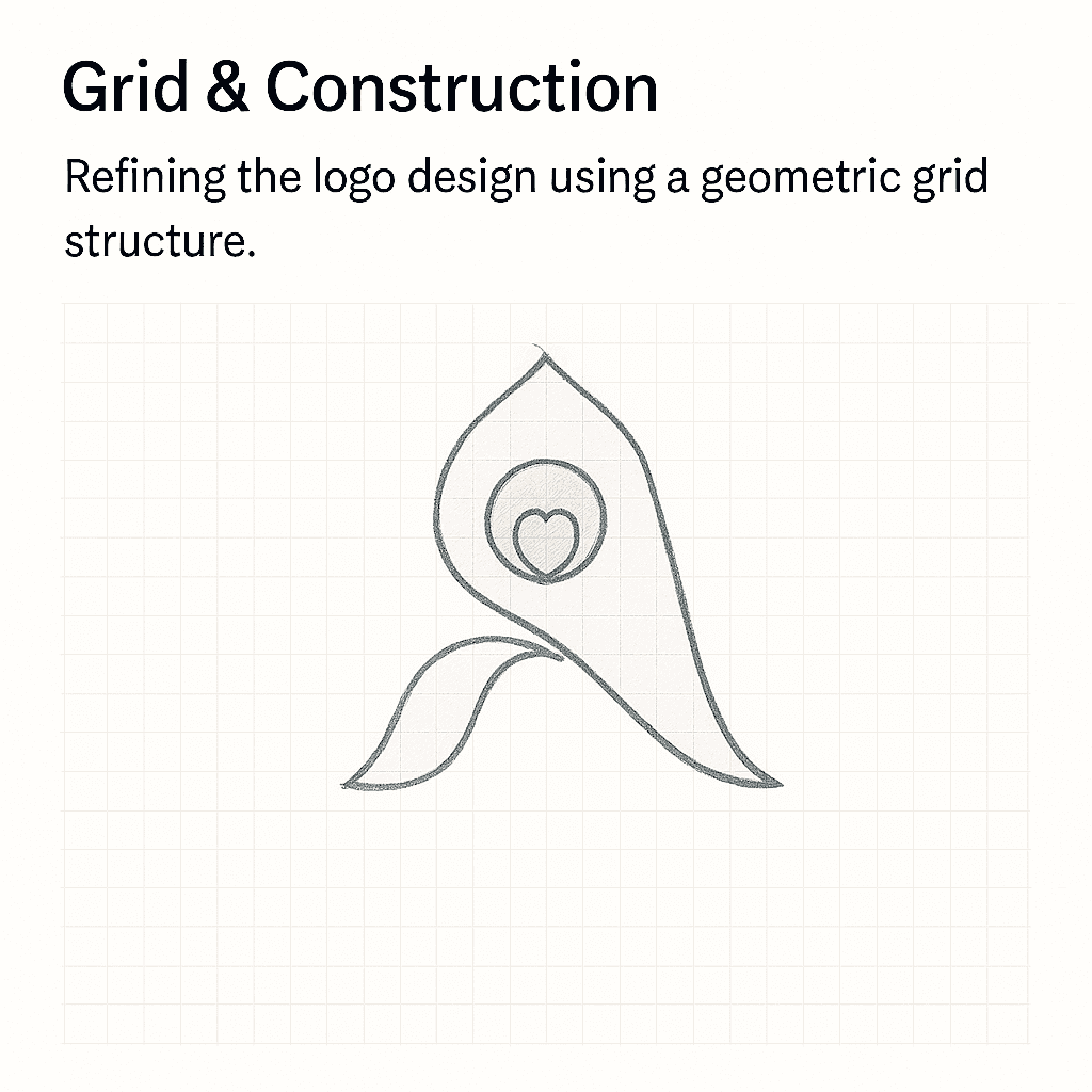 To move from expressive sketches to a reliable, reproducible logo, the design is rebuilt on a geometric grid system. Using circles, guides, and alignment rules, the curves of the A and the feather-inspired shapes are carefully adjusted. The grid helps maintain symmetry between left and right sides, controls curvature, and ensures that the line weights feel intentional rather than arbitrary. This phase is where the logo gains technical strength and becomes more suitable for production use.
