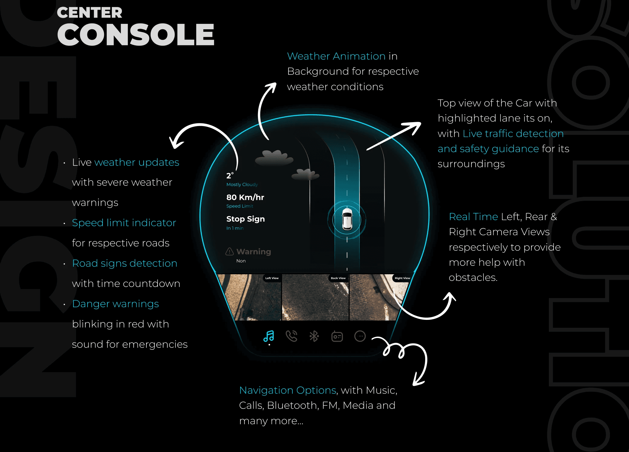 The interface brings together navigation, media, vehicle status, climate controls, and driving assistance information into one consistent design language. Large typography, clear icons, and strong visual hierarchy make sure that the driver can quickly scan the screen and understand what is happening without distraction. The overall experience is meant to feel like a mix of a digital cockpit and a high-end media center, all inside the car.